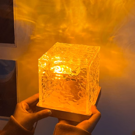 چراغ خواب مکعبی شفاف با طراحی آکریلیک براق و نورپردازی شفق قطبی و امواج دریا، تجربهای آرامشبخش و زیبا برای اتاق شما فراهم میکند 🌊✨.
